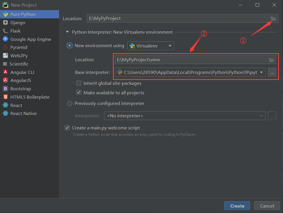 在新建项目菜单中,如图顺序点击,在图上 ① 处点击文件夹的按钮,选择一个文件夹作为你的python项目文件夹,注意:这个文件夹必须是空文件夹!如果在安装Python的时候使用了默认安装模式,那么在图上 ② 处的选项会自动识别Python环境并填写好。设置妥当后,点击 Create。