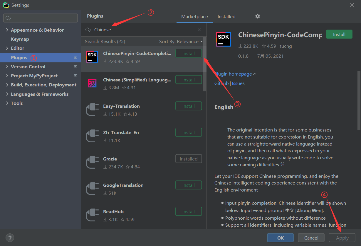 我们点击程序左上角的 File 按钮,点击 Settings ,然后点击图上 ① 处的Plugins按钮,在 ② 处的搜索框输入Chinese回车搜索,接着点击 ③ 处的install并接受用户协议,下载完成后点击 ④ 处的Apply。