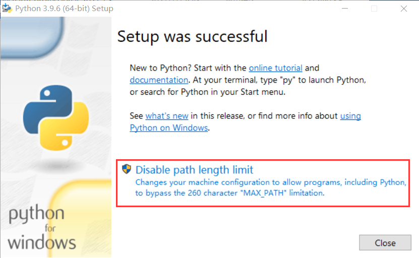 进度条走完以后,不要急着关闭窗口,点击下面的 Disable PATH length LIMIT,点击后这个按钮会消失,这时再关闭安装程序窗口。