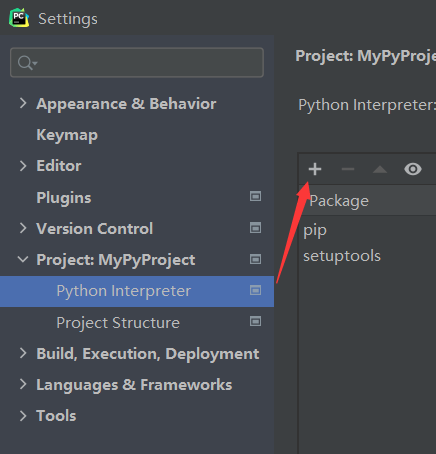 还是在设置列表里面,点击 Project:ProjectName 选项,选择 Python Interpreter,点击小加号。