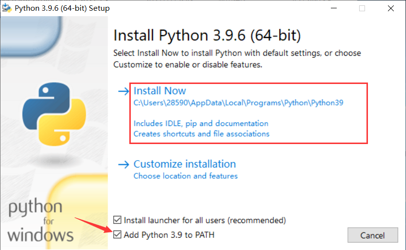 在接下来的窗口中,首先点击窗口下方的多选项 Add Python To PATH;如果没有这个选项,那么说明第一步你并没有右键以管理员身份运行,请关闭安装程序重新打开。这里建议点击第一个 Install Now 直接默认安装,程序会自动配置好一切;并且,网上能找到的80%的资料都是基于你的默认安装位置在C盘,这样出现问题也方便自己解决。