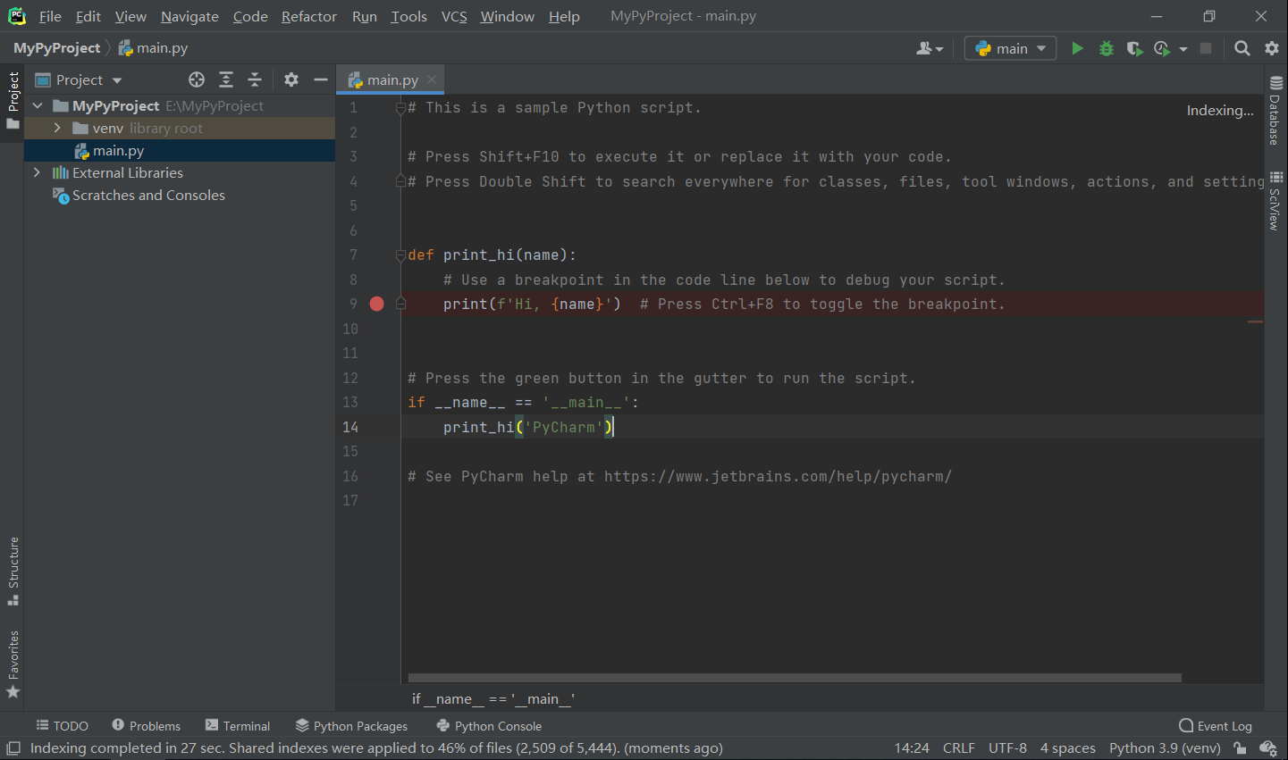 首次运行会出现Daily Tips窗口,在下面有个 Don't Show again,点击,以后就不会再次出现了。项目创建后,会默认生成一个模板的main.py,我们可以运行一下试试(可以使用快捷键Shift+F10)。